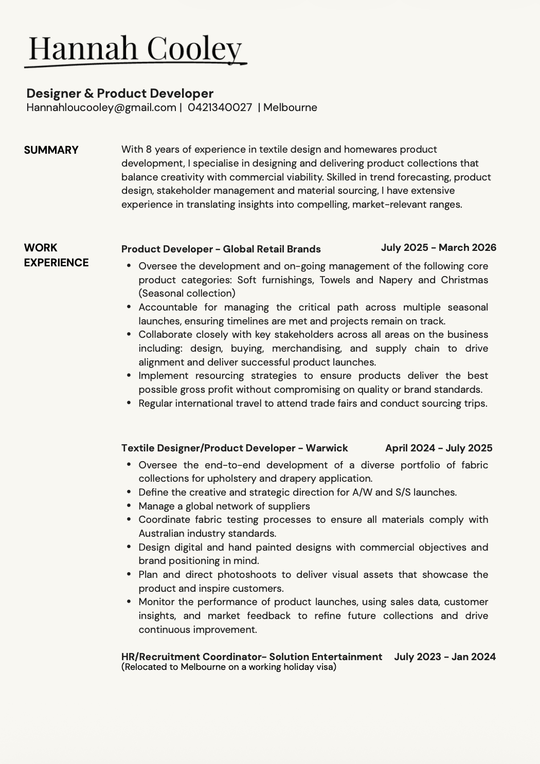 Worked hands-on with a global network of suppliers in India, China, Turkey, Spain, and Italy to translate design concepts into high-quality, customer-ready products.